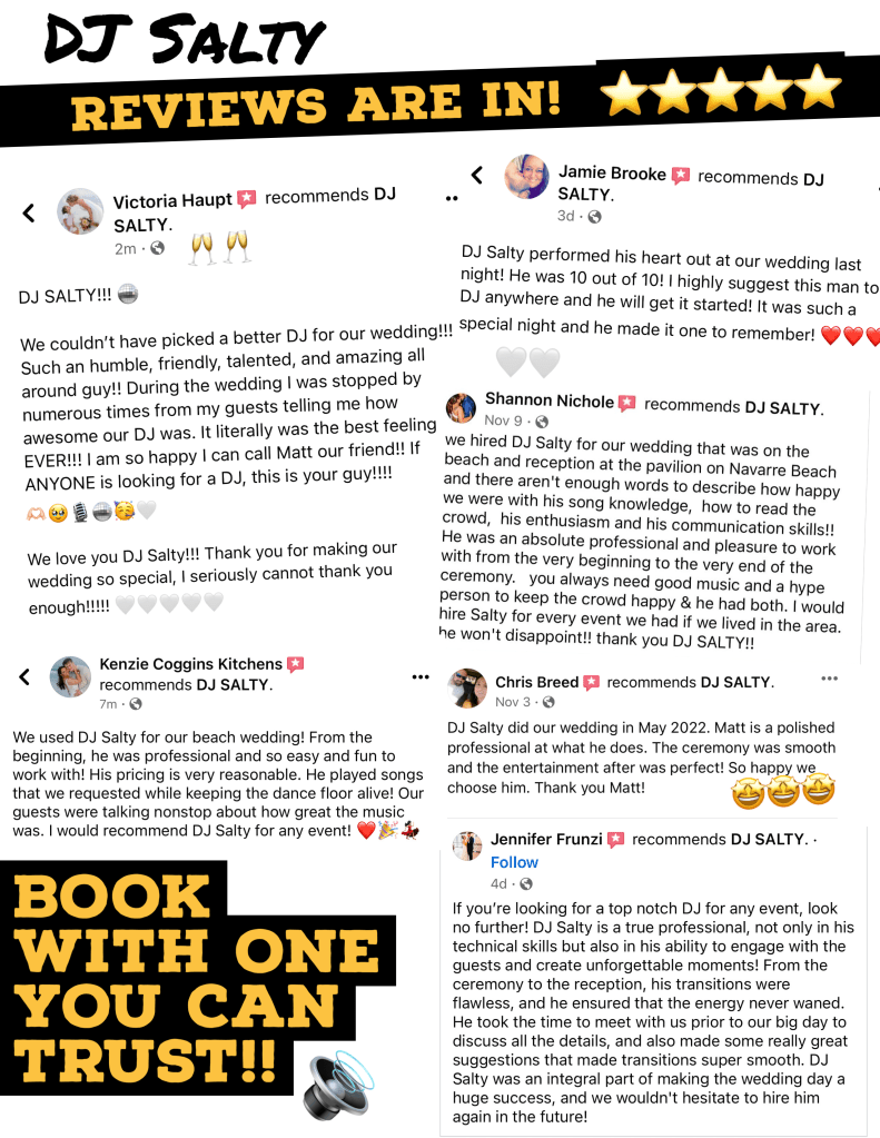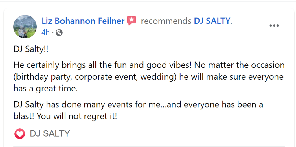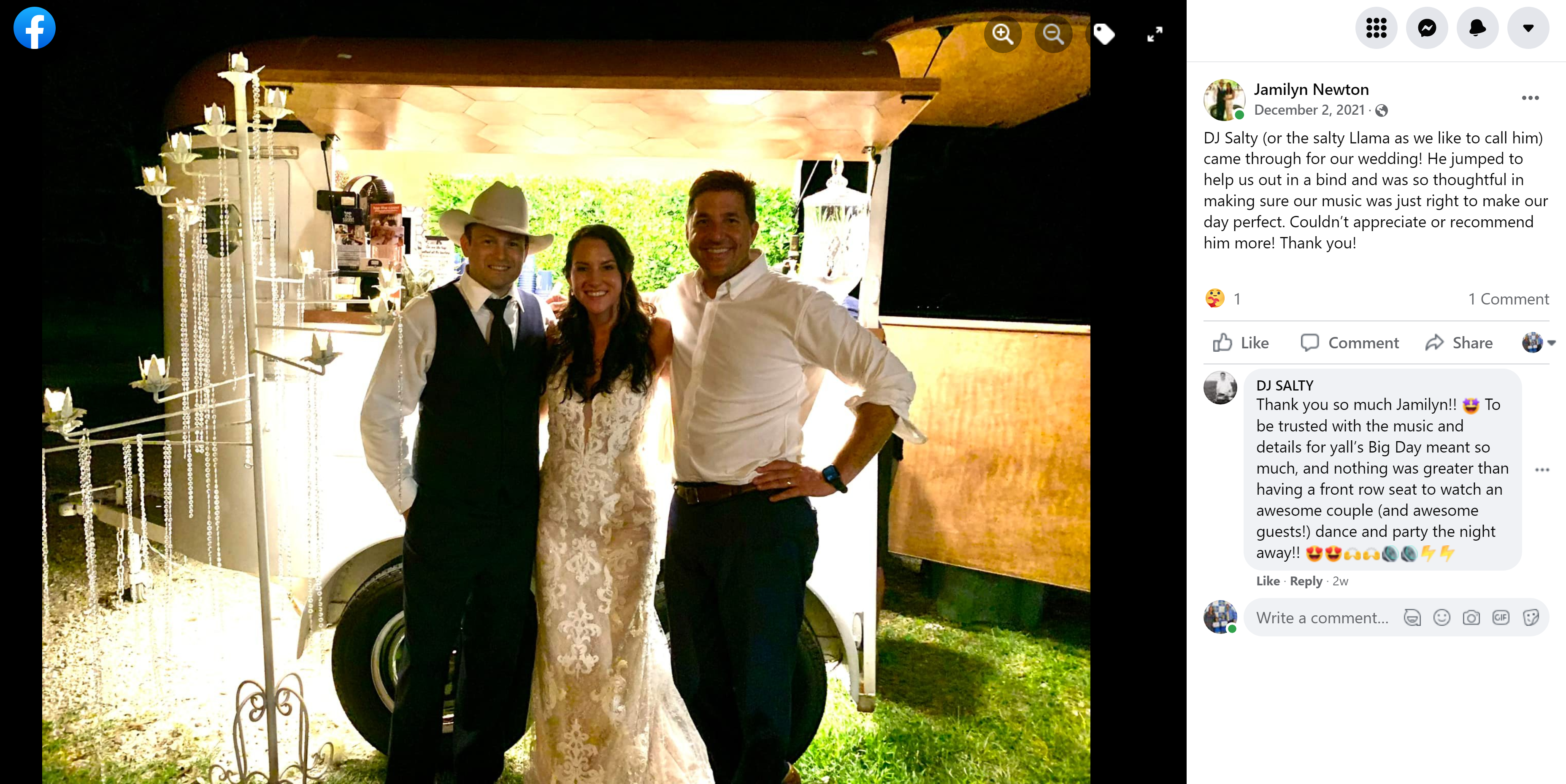 “DJ Salty!! He certainly brings all the fun and good vibes! No matter the occasion (birthday party, corporate event, wedding) he will make sure everyone has a great time. DJ Salty has done many events for me…and everyone has been a blast! You will not regret it!!” -Liz Feilner