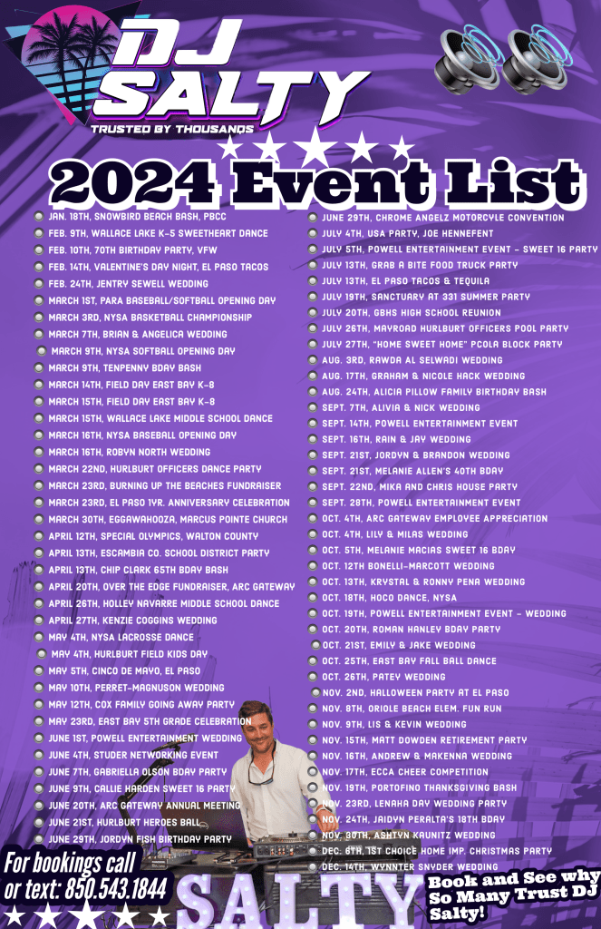 FROM the GULF COAST of FLORIDA, TO the SHORES of ALABAMA I’VE ENTERTAINED EVENTS OF ALL KINDS. (Weddings, Birthdays, Corporate EVENTS, Sweet 16’s, Quinceanera’s, CHARITies, FUNDraisers, School BOOSTERTHON’s, FIELD DAY’s GRADUATION PARTIES, HOUSE PARTIES, CRAWFISH BOILs and MORE!