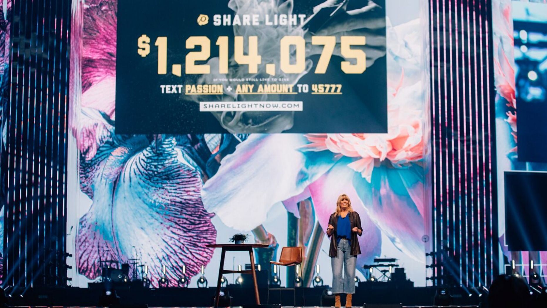 Passion co-founder Shelley Giglio announced the total students raised during Passion 2020 reaching over $200,000 more than their $1 million goal to help get the Bible translated for every person on the planet. (Nolan Knight/Passion 2020)